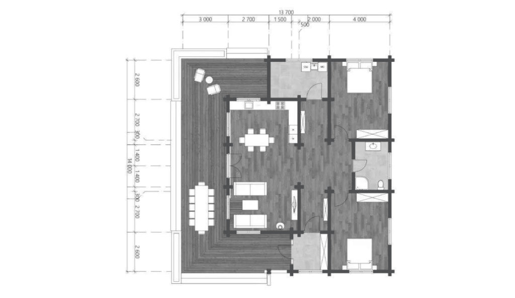 Обшивка наружных и внутренних стен деревом, чистовое напольное покрытие, потолок — всё входит в стоимость
